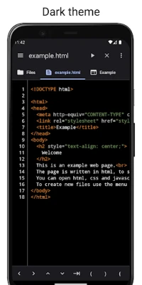 Editor - Code completion for java. - Real Time error checking. - Auto backup if you leave the app without saving. - Undo and Redo. - Support for characters not normally present in the virtual keyboard like tabs and arrows.